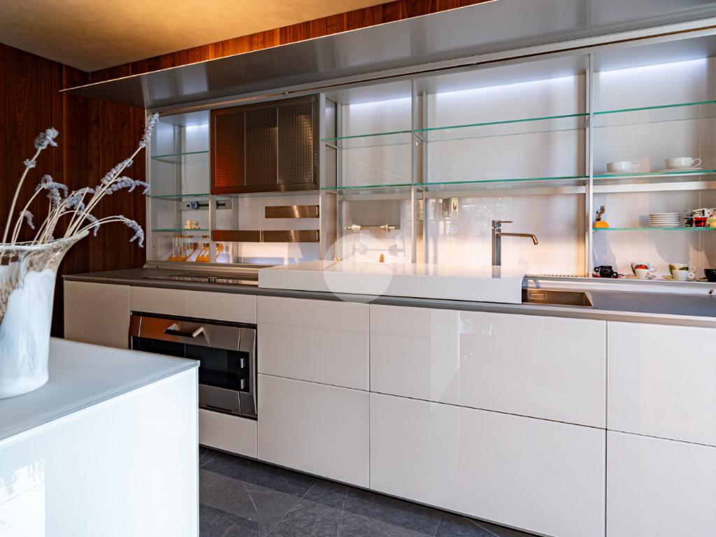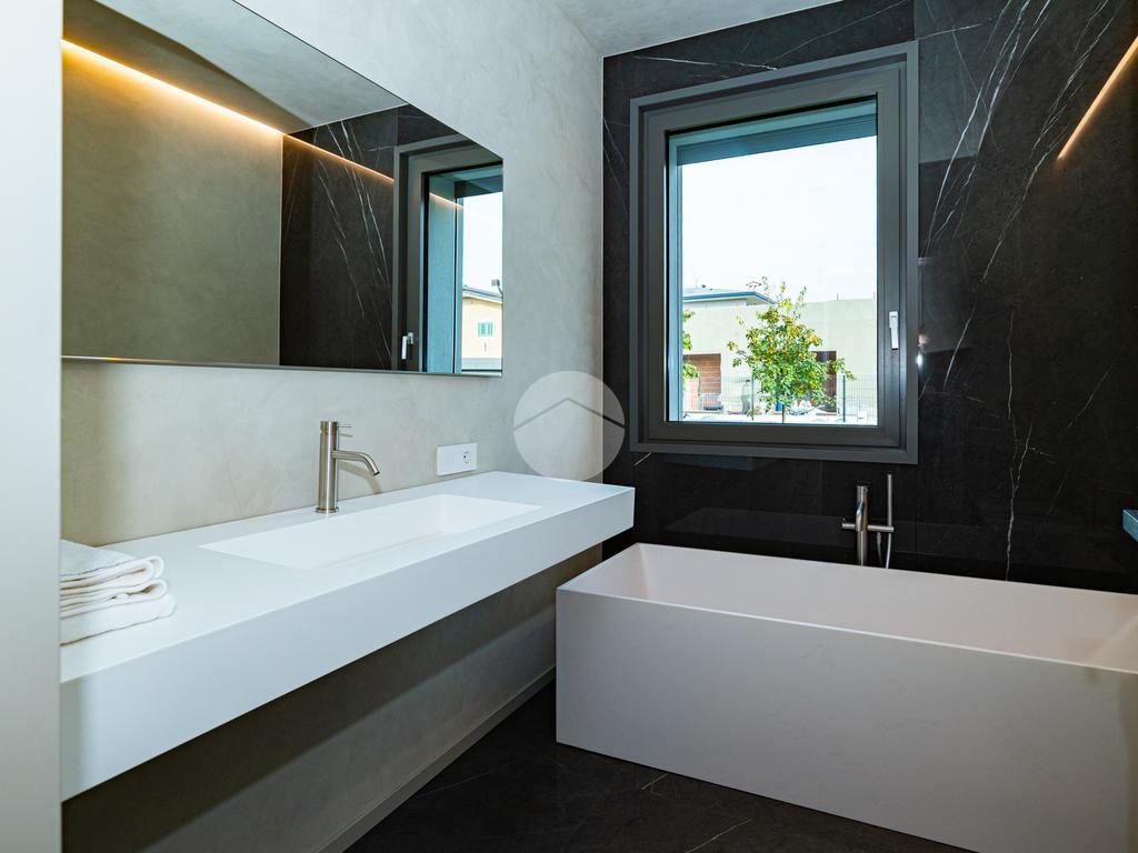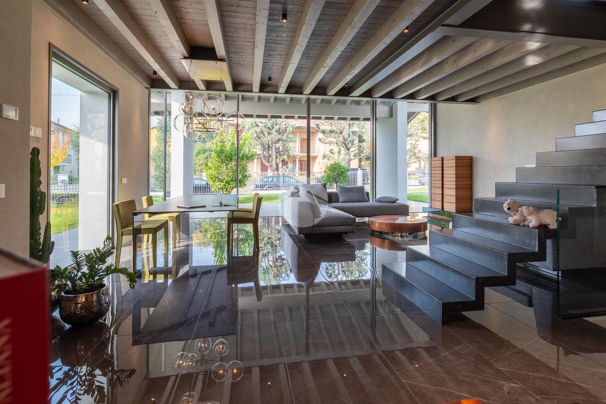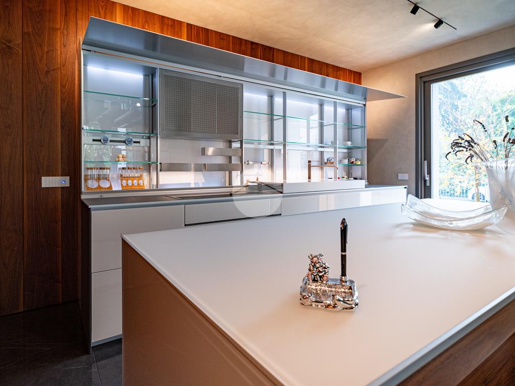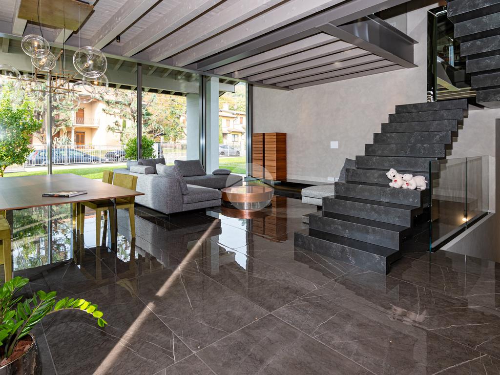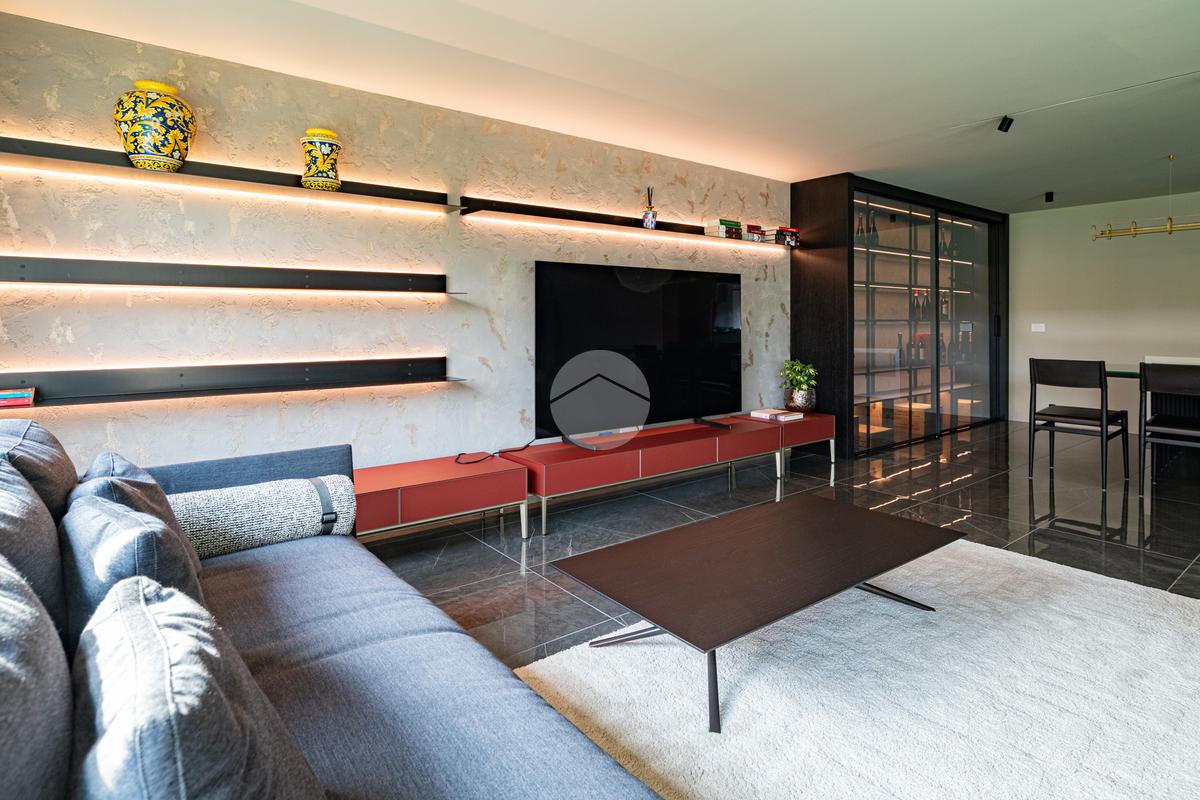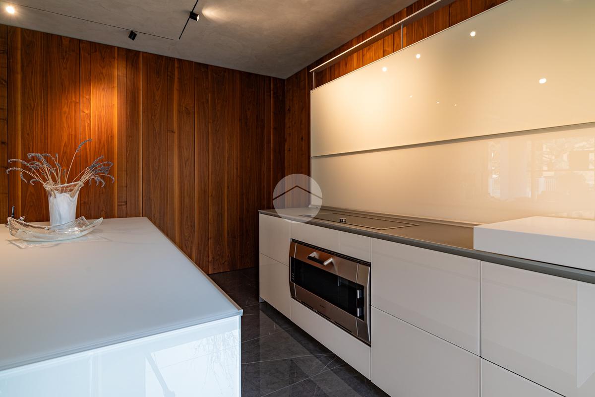 Piano sottostrada – 110 mq: ampio openspace adibito a soggiorno con cucina a vista, utilizzato come “taverna”, con ampia vetrata. Completano il piano cabina armadio, lavanderia con sanitari e vano tecnico. Accesso diretto al box doppio in larghezza di circa 56 mq, dotato di basculante elettrica.