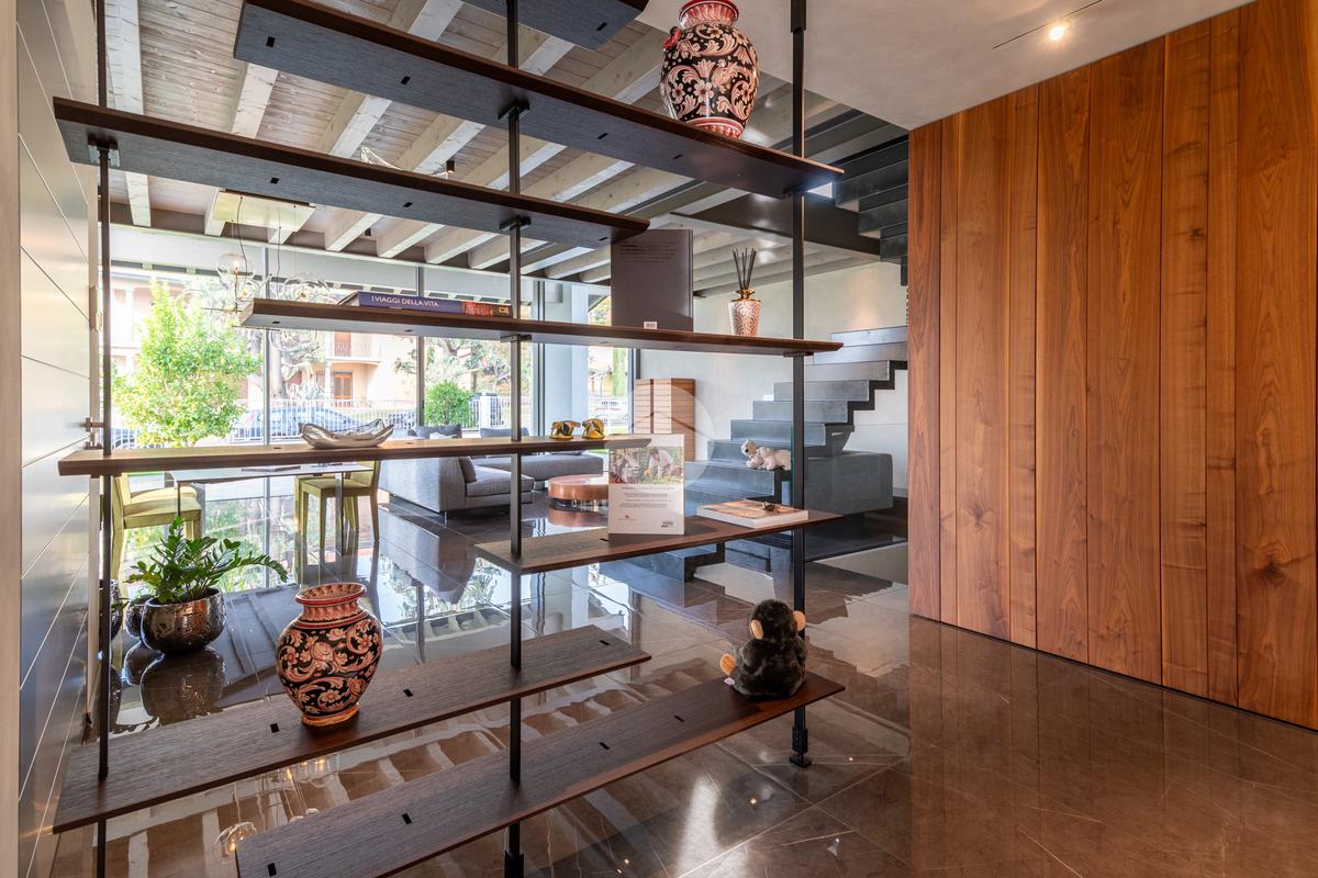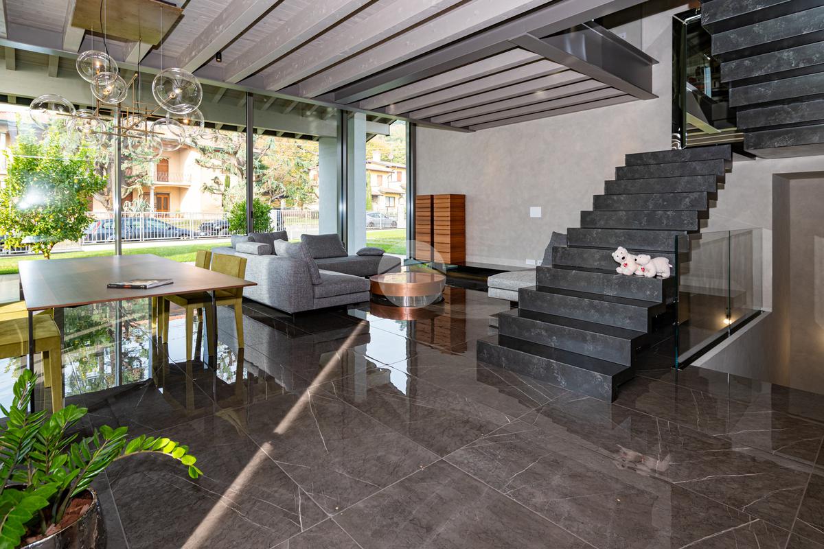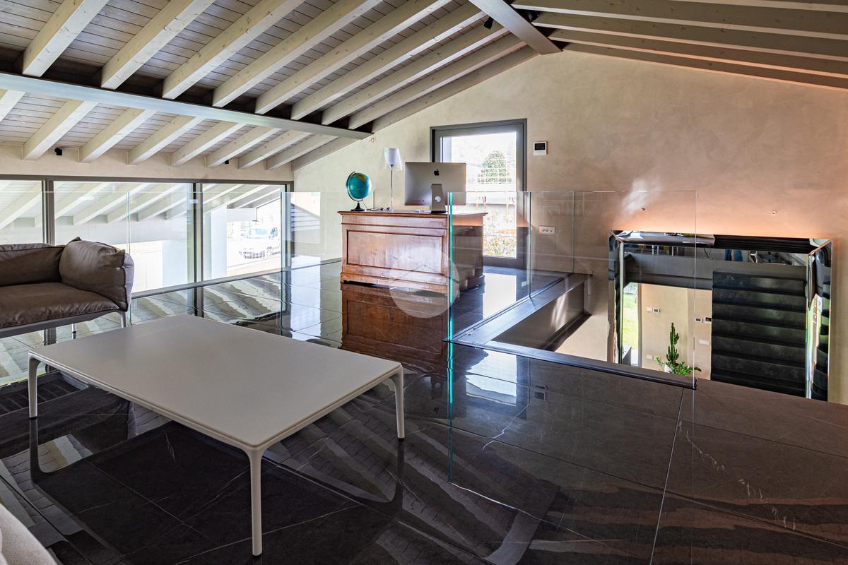Piano primo – 36,5 mq: una scala di design autoportante a doppia rampa, con gradini solidi e ben strutturati separati da un vuoto centrale di circa 10 cm, valorizza la luminosità e la continuità visiva tra le rampe. La scala conduce a un ambiente soppalcato con travi a vista bianche, con altezza massima di 2,74 m e minima di 1,90 m, caratterizzato da un’atmosfera ariosa e moderna.