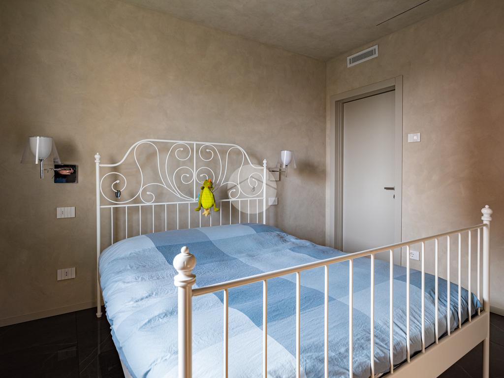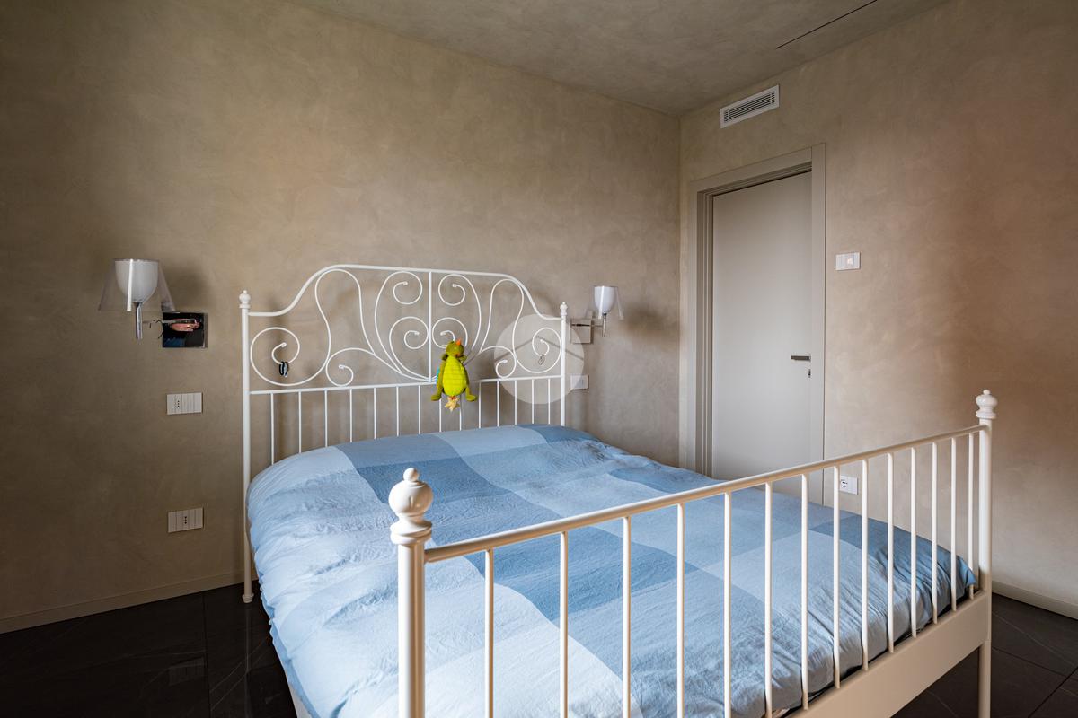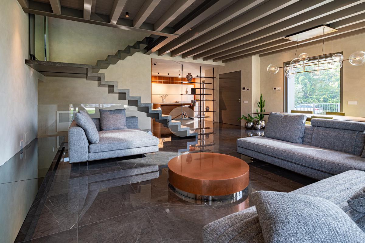 Piano terra – 120 mq: entrando attraverso un’imponente porta blindata, si accede a un luminoso soggiorno con cucina a vista, completa di ampia isola centrale, perfetta per convivialità e momenti di relax. Il soggiorno è valorizzato da una soffitta con altezza fino a 5 metri e un’ampia vetrata, che conferiscono luminosità e una straordinaria sensazione di spazio. La zona notte comprende una suite padronale con bagno privato finestrato con doccia; tramite un elegante disimpegno si accede a due ulteriori camere matrimoniali, servite da bagno finestrato con vasca.